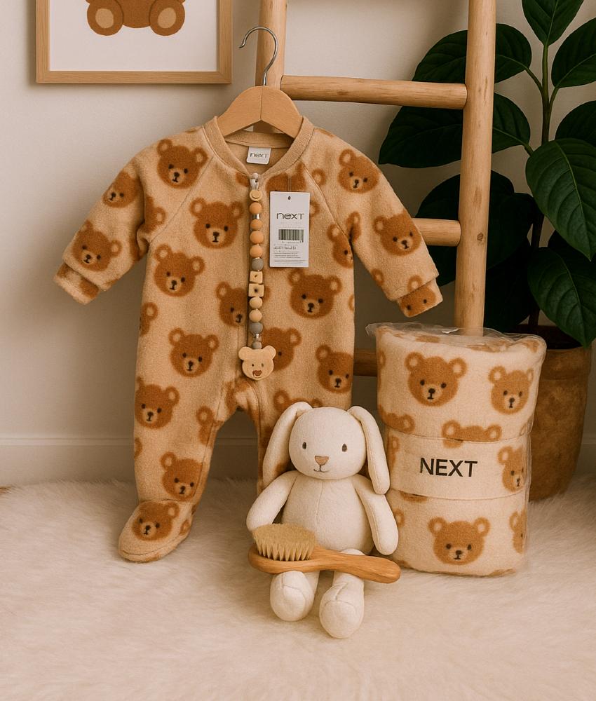 👕 لبس مواليد شتوي باللون البني بتصميم راقٍ وملمس ناعم مريح للطفل.🪄 بطانية مواليد فاخرة بنفس اللون والتصميم لإضفاء لمسة دافئة.🐻 لعبة دب قماشي ناعمة تضي...