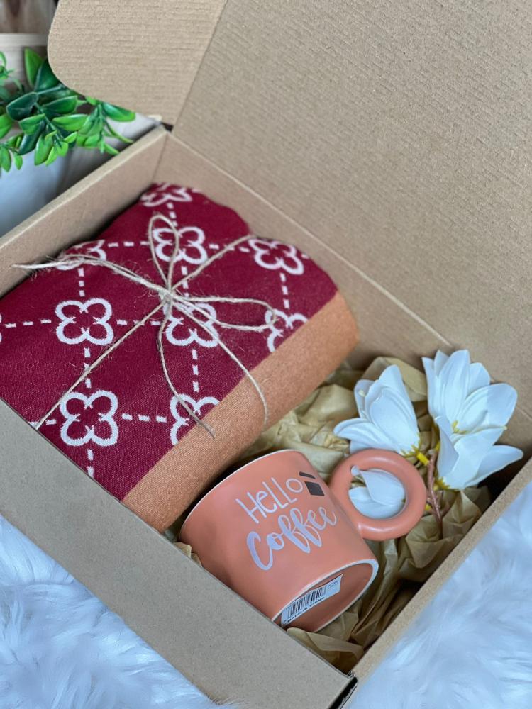 الهدية مو بس قطعة تُقدَّم، الهدية رسالة ذوق واهتمام ومع هدية شال كشميري ورد من اليجنت تاول، تجمع بين اللمسة الدافئة للشال بتصميم جاكار عصري مطرز بزهور أنيقة وبين لمسة عملية بكوب سيراميك أنيق يرافقها.